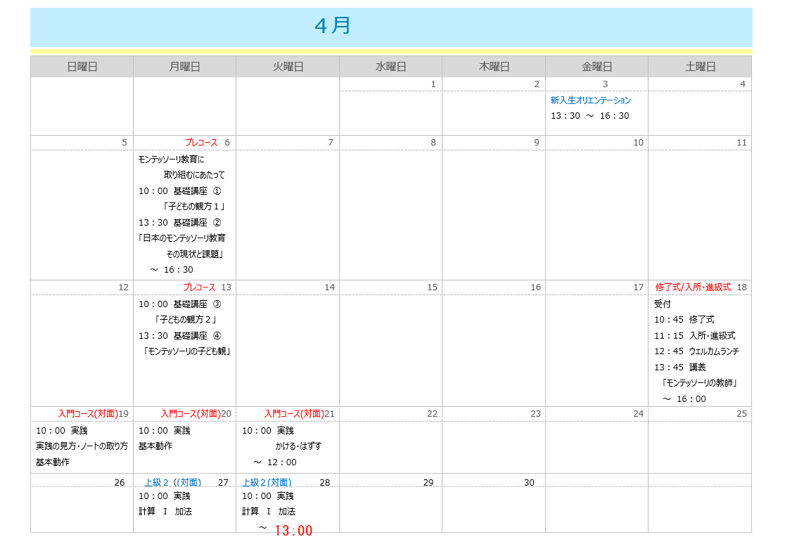 | 4月1日 | 入門・基礎クラス |
